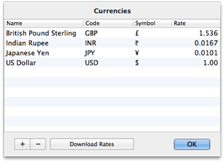 First, make sure you are connected to the Internet. Choose Tools > Download Currency Exchange Rates, or open the list of currencies (see above) and click the "Download Rates" button. iBank will connect to Yahoo! Finance and download updated exchange rate information automatically.