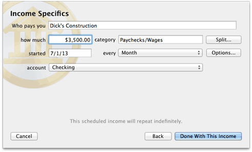 - Enter the name of the business or individual that pays you, how much you will receive, which category the income should be assigned to, when the payments will begin, how often they will repeat, and which account they will be recorded in. To view a list of all available categories, select the category field, make sure it is empty, and press the down arrow key on your keyboard. iBank will prompt you to create a new category if you enter one it doesn't recognize.