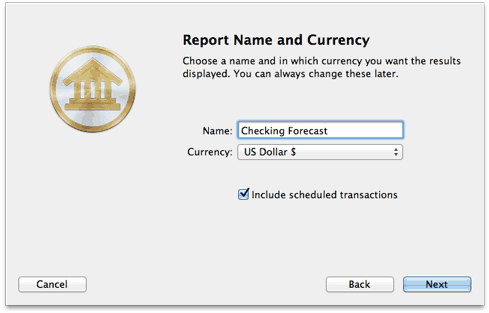 This screen lets you choose a date range for the report. Click the popup menu button and select from a variety of predefined ranges: options that end with "to Date" indicate periods of time that are relative to the current date; other options represent fixed periods of time. To ensure that the Forecast report projects your account balances into the future, choose a date range that extends into the future.