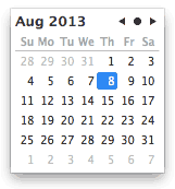 When the calendar is visible, use the arrow keys to move the selection or click the buttons at the top right to navigate. Click the arrows to change the month displayed, or click the dot between the arrows to return to the current selection. Click a date to enter it, or press the Tab key to accept whatever date is currently selected.